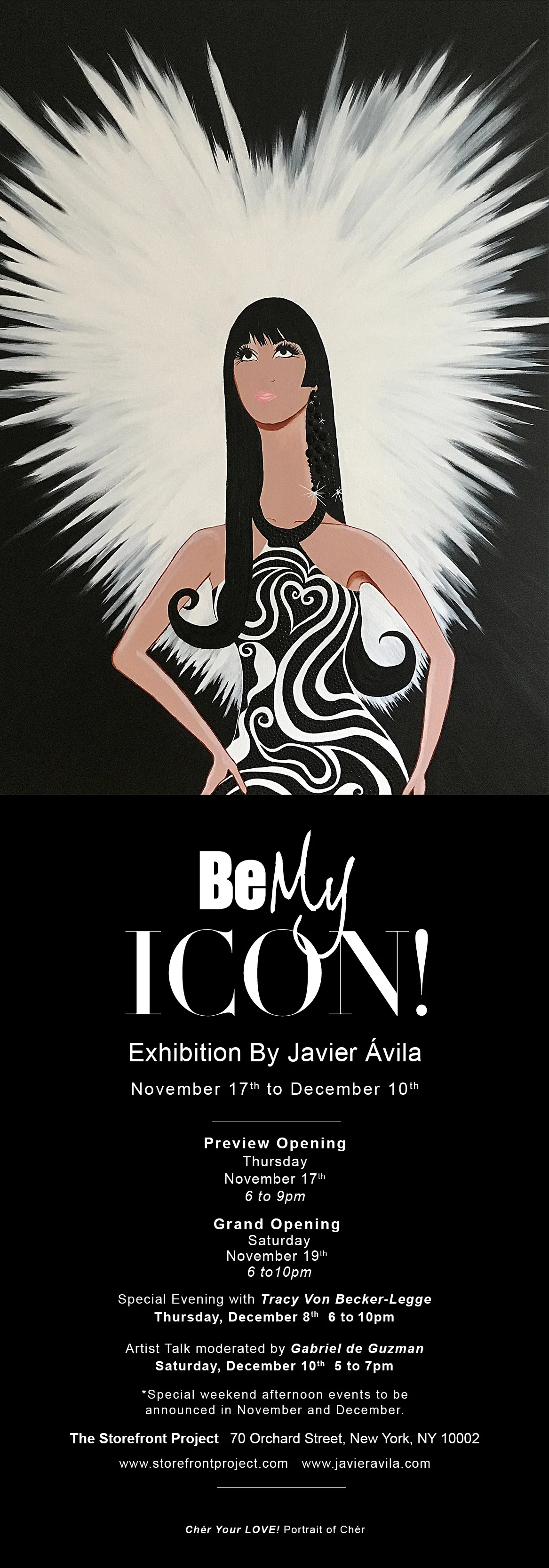 A spectrum of color, power and whimsy unites the inspirational muses on display in BE MY ICON!, an exhibit by the New York City-based painter Javier Ávila showcasing his large-scale portraits of famous, glamorous and influential women including Elizabeth Taylor, Chér, Sophia Loren, Jacqueline Kennedy and The Supremes.